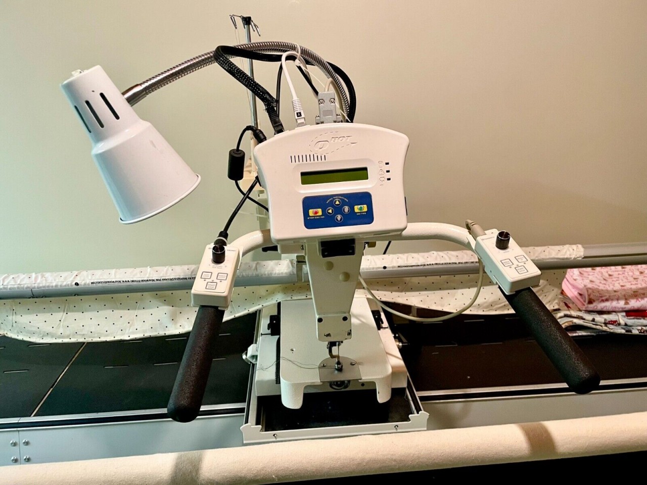Lightly used Quilting SystemHusqvarna Viking Mega Quilter 18 x 8 long arm sewing machine (18 in length, 8 in high).QBOT V 2.09 computerized quilting system for long arm quilting machines. Includes quilting designs and allows automatically recording your own designs, SD card transfer to/from qbot. Additional designs can be purchased. Inspira Imperial Quilting Frame with double rolls and dual handle carriage system. Two set-up lengths available, Crib (60in) and King (120 in). Total length when configured for King is 13ft.Includes light fixture and 4 spool thread standAll original Manuals with machines.